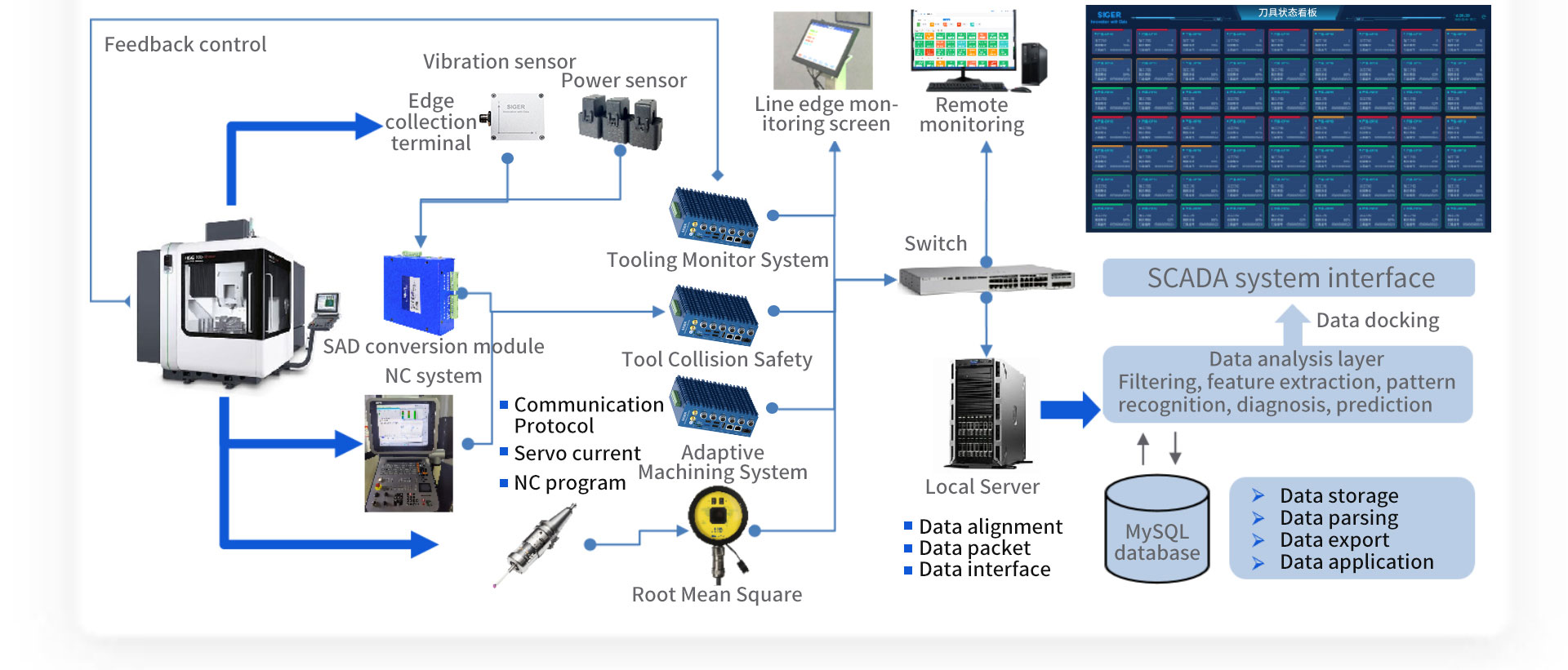 The system reserves communication interfaces that support the export of alarm data and characteristic curves, as well as the summary and display of tool monitoring data and third-party platform docking display