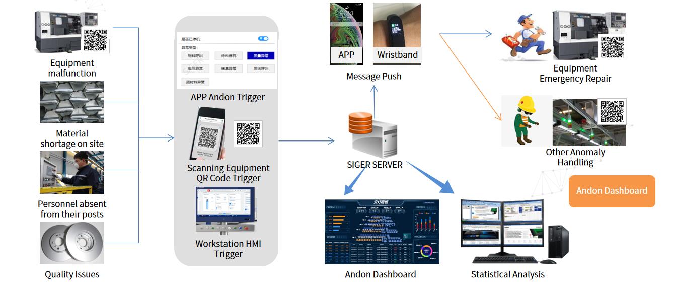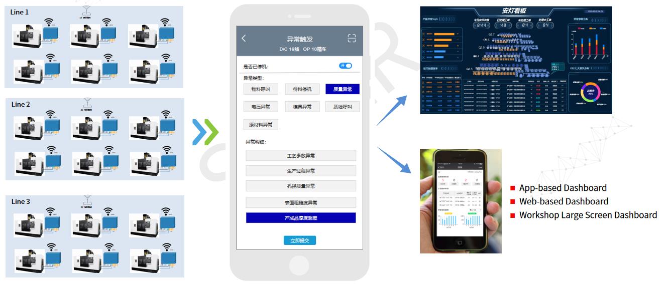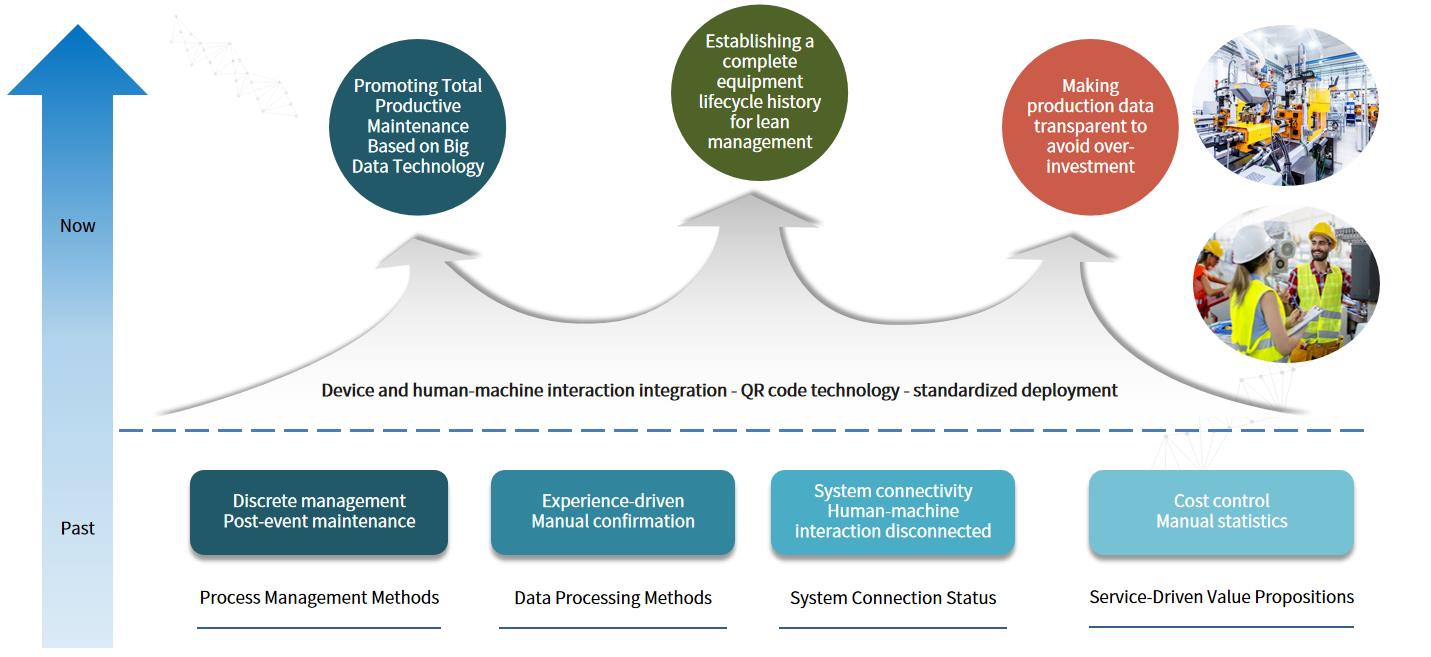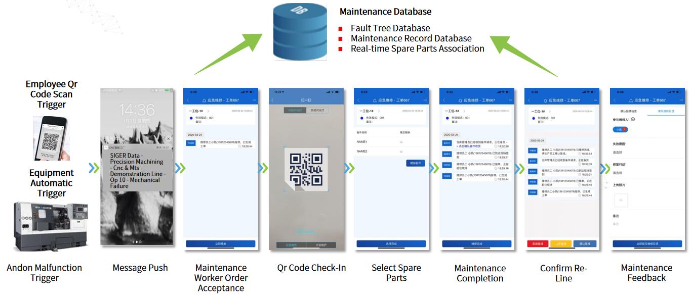 The entire repair reporting process via mobile APP: Equipment fault alarms are triggered by scanning a QR code or by automatic equipment activation. Repair personnel check in by scanning a code. Each step is simple and clear, effectively reducing workshop equipment repair response time and improving repair efficiency, thereby indirectly improving production efficiency.