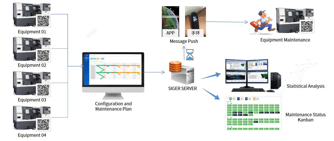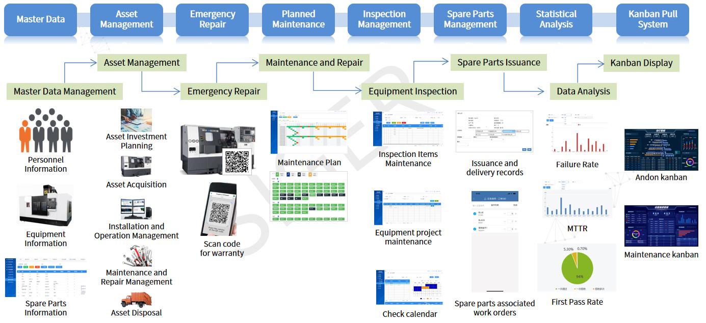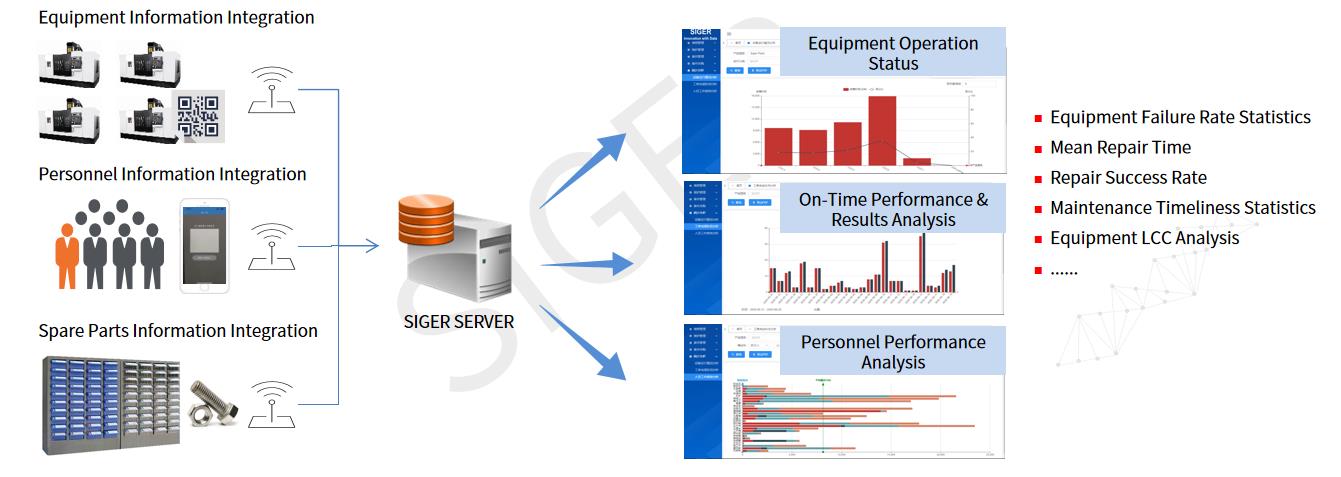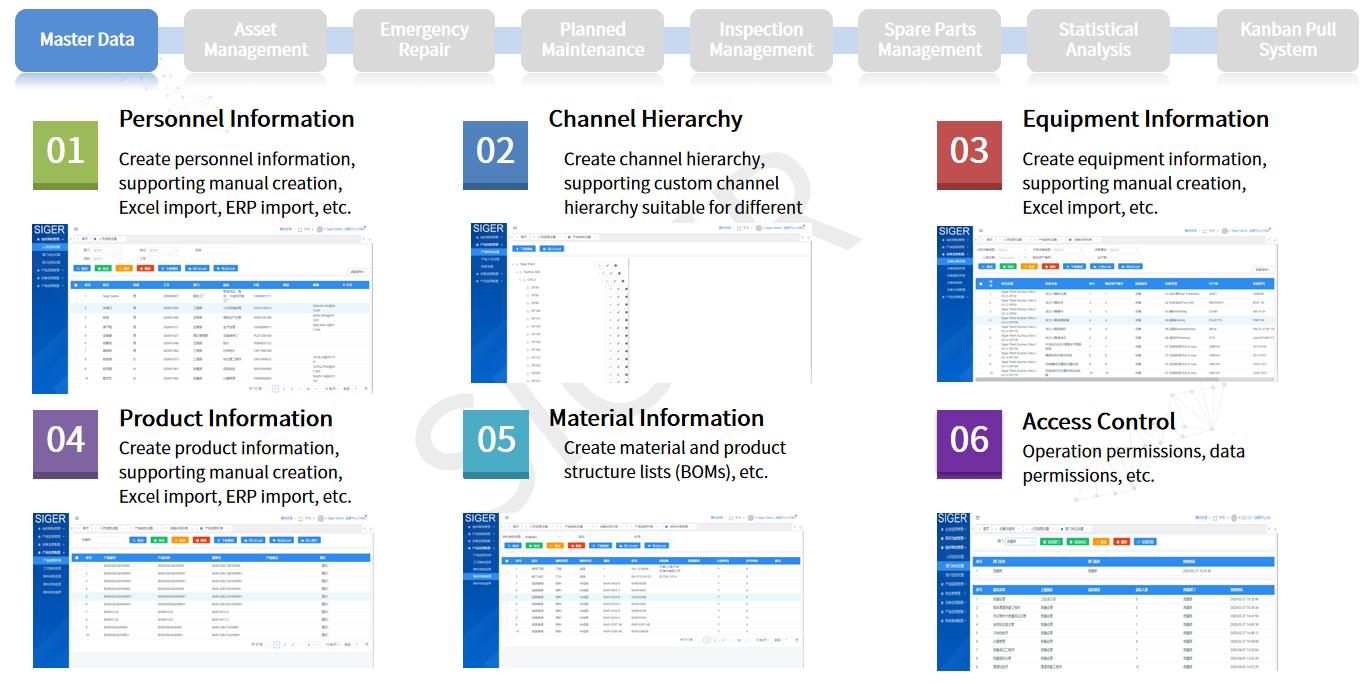 SIGER Enterprise Asset Management System (EAM) is an equipment maintenance management software tailored by SIGER Data to address the challenges of equipment management in industrial manufacturing enterprises. It supports synchronous control via mobile phone and PC, effectively solving problems such as the difficulty in centralized management, real-time monitoring, and timely repair reporting of complex factory equipment. It also provides functions such as spare parts management, equipment inspection, asset inventory, visualization of maintenance index analysis, and access control, helping you build a more complete factory management system.