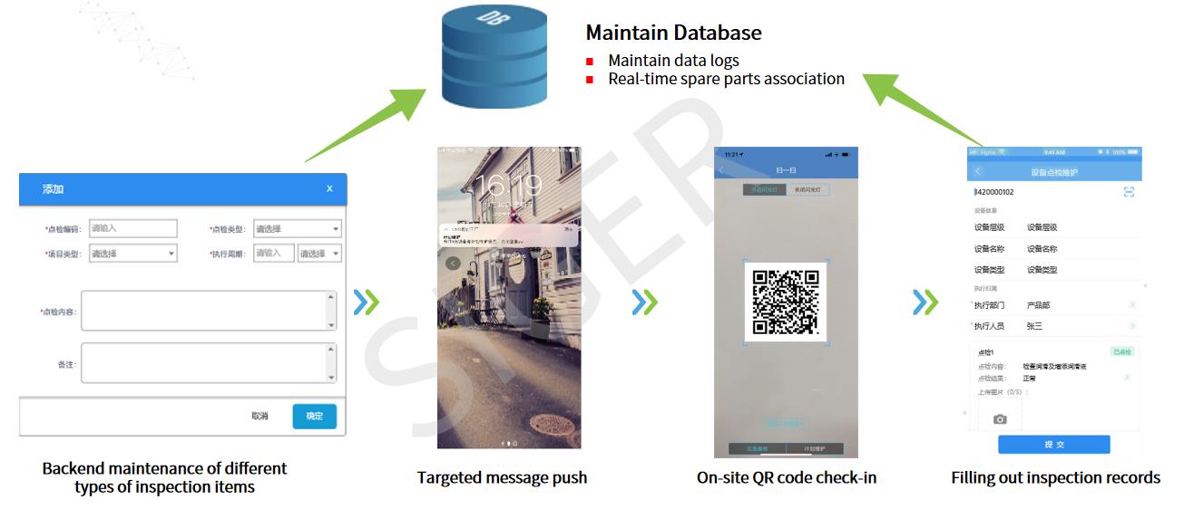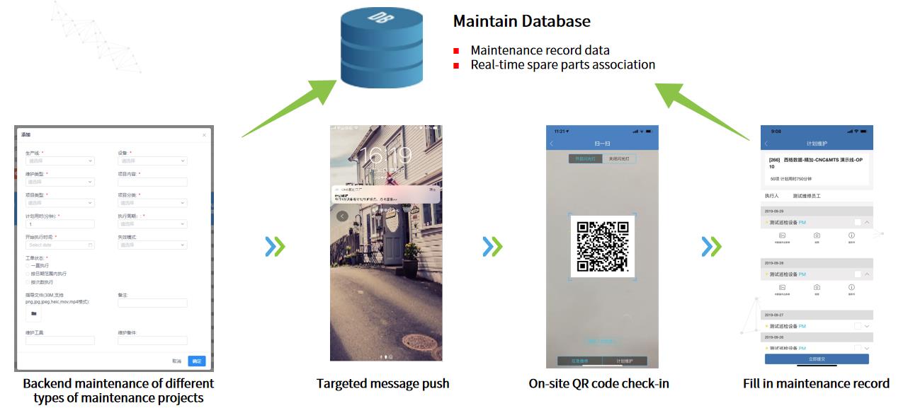 Equipment planned maintenance process: Add maintenance plans and mobile APP operation process. When adding maintenance plans, you can choose from three project types: PM, AM, and CMP. After receiving the push notification on the mobile APP, maintenance personnel can accept the order and scan the code to perform maintenance. Planned maintenance can improve the service life of equipment and reduce investment costs.
